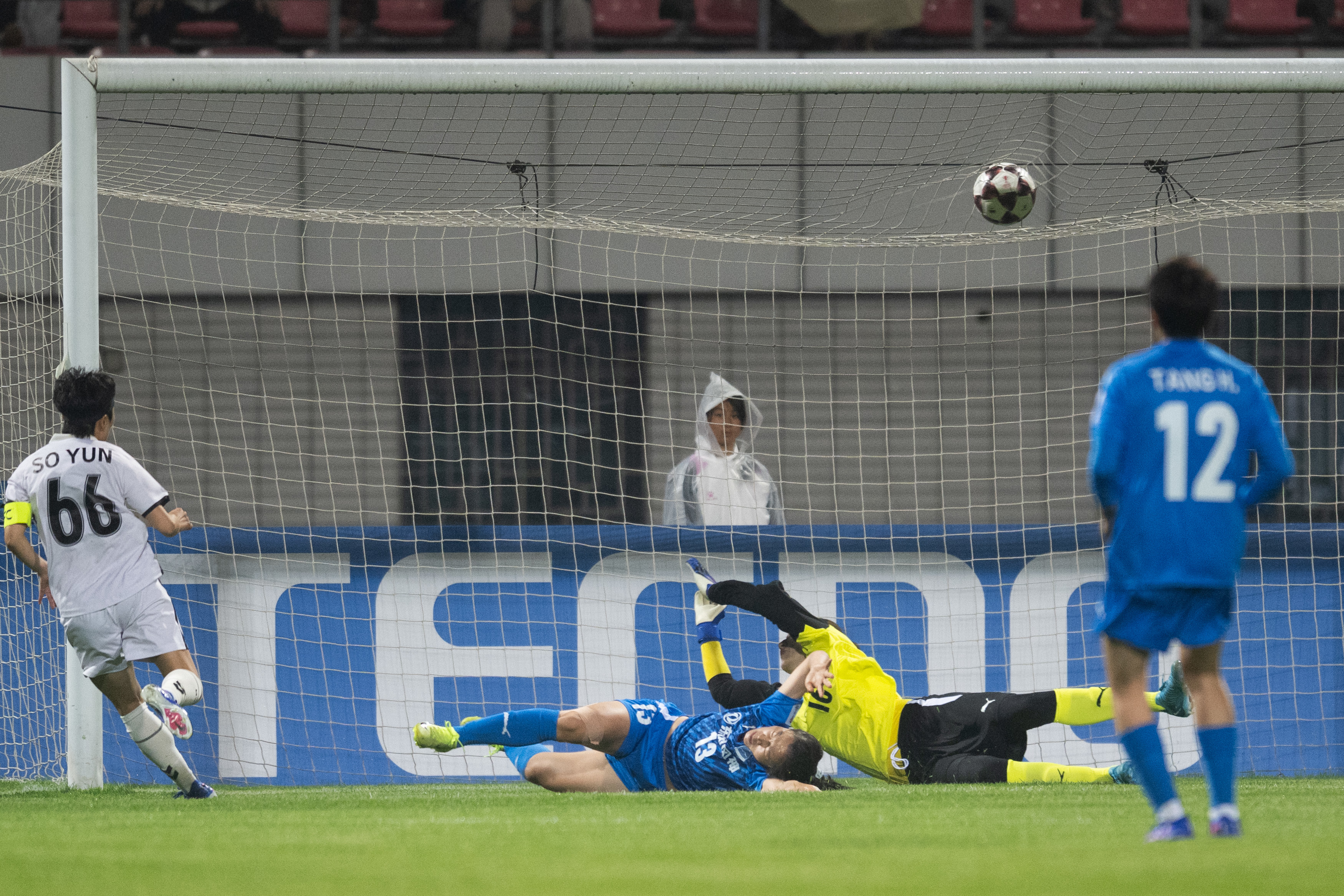 3月29日,武汉车谷江大队守门员彭诗梦(右二)在比赛中扑救失利。新华社记者 肖艺九 摄